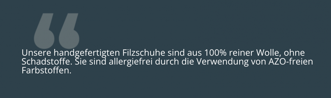 Unsere handgefertigten Filzschuhe bestehen aus 100 % reiner, umweltfreundlicher Wolle aus Neuseeland. Die Wolle enthält keine giftigen und allergieauslösenden Stoffe und ist auch ohne AZO-Farbstoffe.